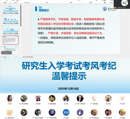 在考前准备提醒环节,班会结合研考实际要求,为同学们提供了全面的备考指引。包括证件、文具准备,考点熟悉,考试流程,此外,班会特别强调,严禁携带手机、平板电脑、智能手表、智能眼镜等通讯或存储设备进入考试封闭管理区域,进入智能安检门前需将相关设备交由公司或考点专人保管,严禁抄袭、传递答案、冒名顶替等违规违纪行为。