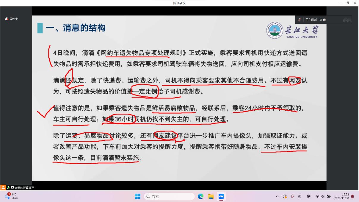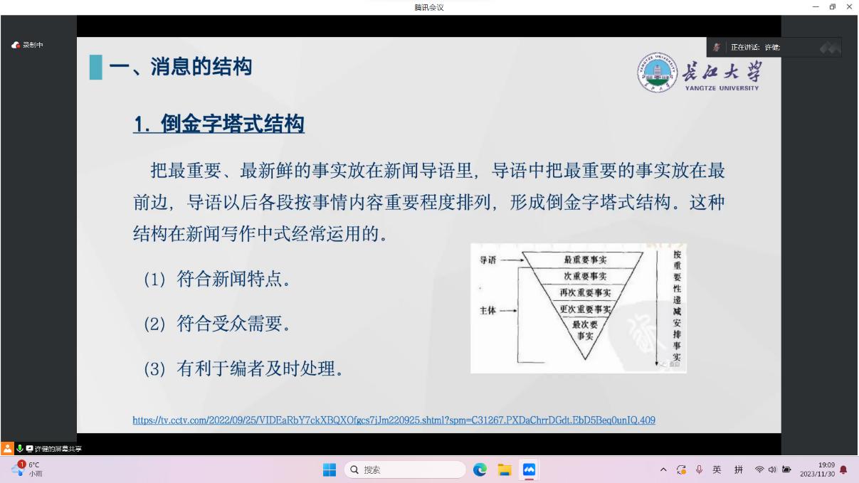 在讲解消息的结构环节中,许健老师例举了倒金字塔式、正金字塔式、平行结构三大结构形式,并通过逐字逐句分析相关稿件的方式,使同学们更深入地认识到了新闻稿结构的写作技巧。