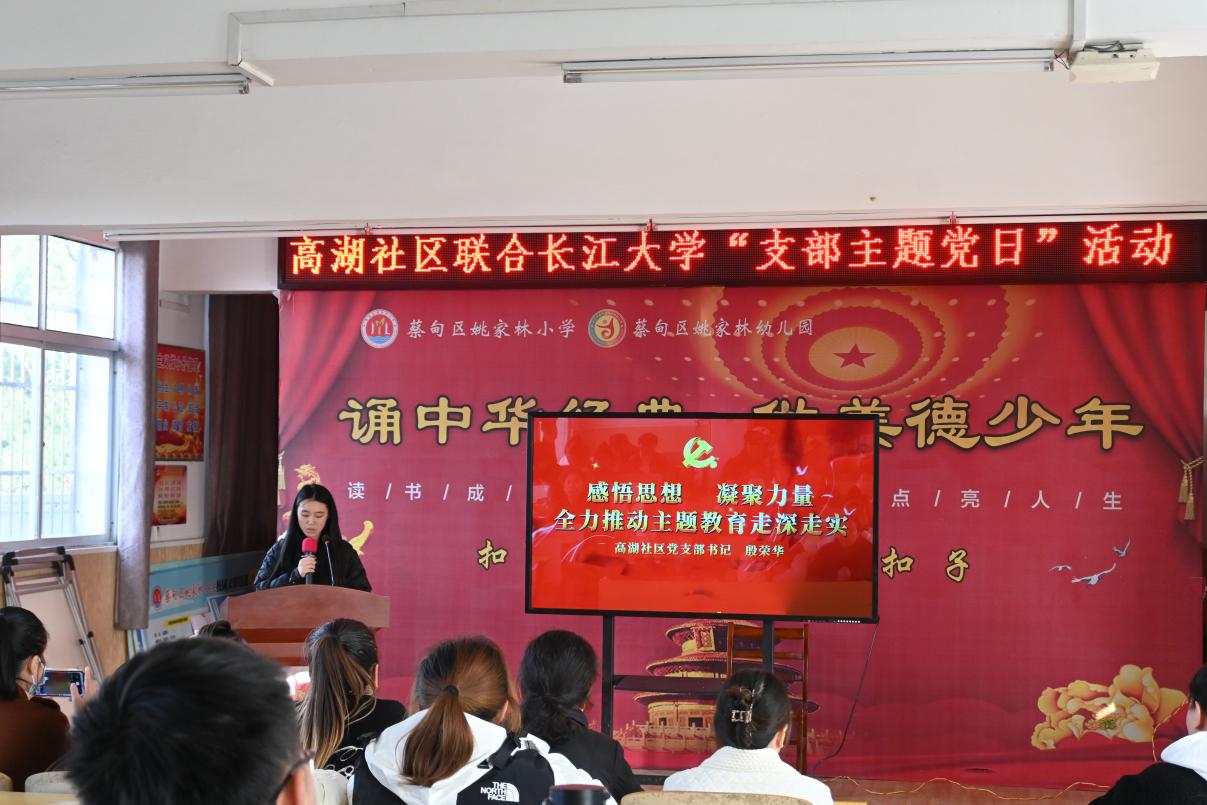 活动伊始,高湖社区主任、党支部书记殷荣华以“感悟思想,凝聚力量,全力推动主题教育走深走实”为题,为志愿者们上了一堂生动的党课。随后,太阳成城集团tyc234cc官网代表高陈宇同学发表主题为《学思践悟守初心,知行合一勇担当》的感想。她表示:青年人应该学习新思想并坚定理想信念,应该严于律己,勇担责任,积极面对生活,并在实践中实现自己的价值。最后,高湖社区副主任、支委委员袁锦发表党课感想。