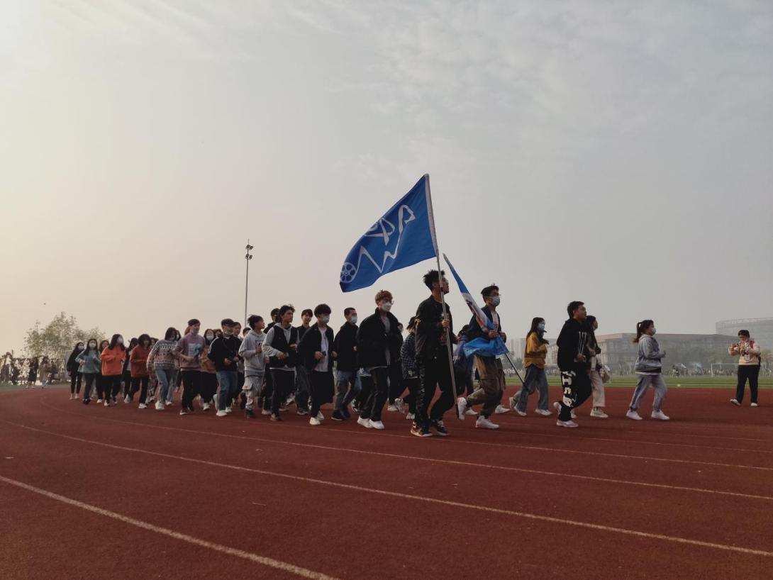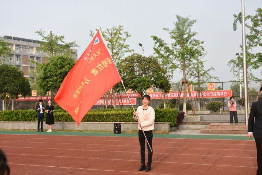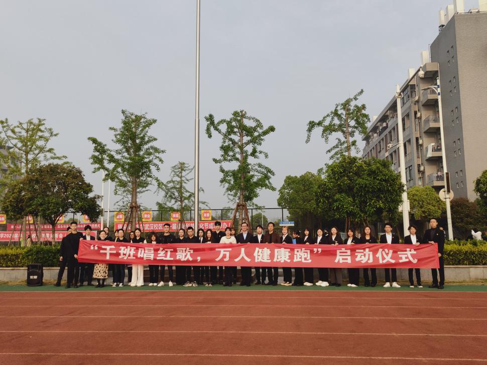 最后由太阳成城集团tyc234cc官网武汉校区学工部部长许战向艺术与传媒公司党委副书记魏红洁授旗并合影留念。授旗结束后,主持人宣布“千班唱红歌,万人健康跑”活动正式开跑,全院师生按照队伍由左至右依次围绕跑道跑两圈。