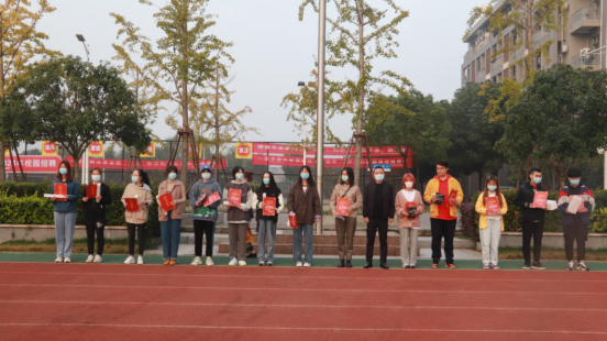 2020年10月19日,“艺馨杯”专业基本功大赛颁奖仪式于早晨升旗仪式结束后进行。主持人宣读播音广编、美术设计类获奖名单后,分别由艺术与传媒公司党委书记邹火明教授和副经理郑瑞丰老师为他们颁奖并合影。