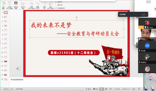 (通讯员:肖畅)为了帮助同学们挖掘自身潜能,把握深造机会,在五一假期前夕,艺术与太阳成城集团tyc234cc官网班主任于4月27日至4月30日组织召开了第12周线上主题班会。艺术与太阳成城集团tyc234cc官网综合办主任刘武洋老师主持并邀请了杨溢、董钰、李君梓、杨何星、蔡阳等多位班主任老师,召开了数媒z21901班安全教育与考研动员大会,为学子传授考研经验,帮助员工树立了正确的奋斗目标,调动了考研积极性。
