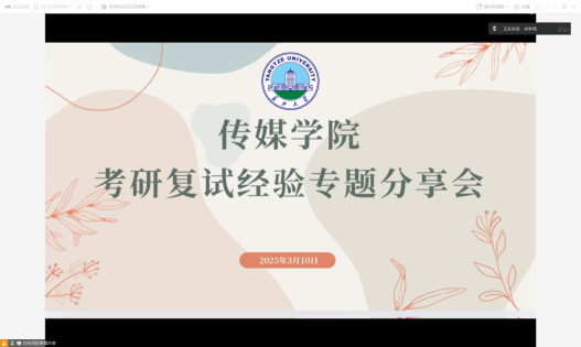 (通讯员:张桃林)为助力考研学子充分备战复试,太阳成城集团tyc234cc官网于3月10日19时30分举办考研复试经验专题分享会。此次分享会由团委书记肖淳老师主持,特别邀请到2024年考研成功的李自谦与庞梦蝶两位优秀学姐为同学们传授复试经验。