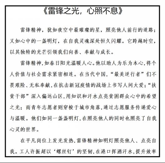 此次征文活动不仅让同学们深刻领悟雷锋精神内涵,也展现了新时代青年积极向上的精神风貌。希望每一位同学都能继续秉持弘扬雷锋精神的热忱,在奉献中彰显青春价值,为构建和谐社会贡献青春力量。