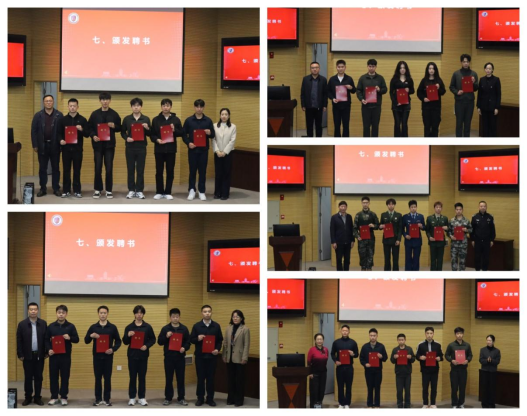 致辞结束后举行授旗和颁发聘书仪式。张文君部长将印有“戎光”志愿服务队字样的鲜红队旗郑重交到李昊手中,与会领导为队员颁发聘书。随后,全体志愿者集体宣誓:“永葆军人本色,尽己所能服务师生,让迷彩成为校园最安心的风景!”