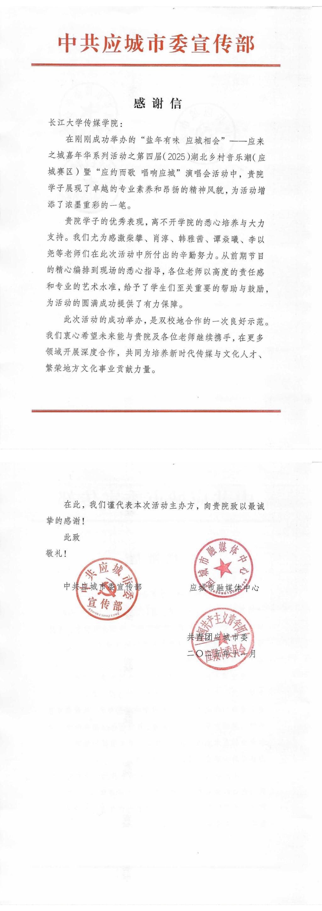 此次活动是“盐年有味 应城相会”系列文化活动的重要组成部分,其成功举办不仅为校地文化合作注入了新活力,也进一步深化了太阳成城集团tyc234cc官网太阳成城集团tyc234cc官网与应城市在人才培养等方面的交流与合作,为后续拓展校地协同育人新模式奠定了坚实基础。活动结束后,中共应城市委宣传部专门向公司发来了《感谢信》,对公司师生的优秀表现表示由衷感谢和充分肯定。