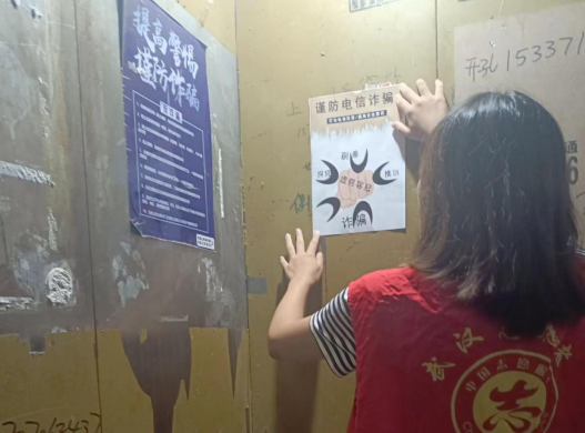 在此次实践活动中,队员涂心萍在社区通过书记采访、实地考察等方式了解社区群众反诈意识的情况,设计宣传方案,在社区反诈宣传栏、居民电梯等公众场所张贴其创作的海报进行宣传,同时进行走访式反诈宣传,发放反诈海报及给居民播放反诈宣传视频。在宣传过程中,王叔叔向队员分享了他的经历。他提到,他曾在某短视频平台上看到一则兼职广告:“只需拨打电话,在家轻松日赚500元。”他联系广告上的联系方式并根据对方(诈骗团伙成员)的要求进行操作,在被骗人员和诈骗团伙成员间充当“传话筒”的角色,直到警方的出现,他才知道真相。
