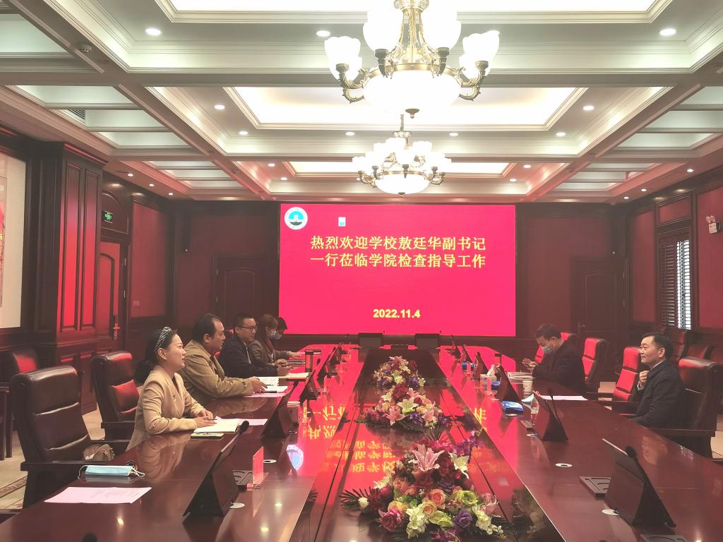 (通讯员:郑瑞丰)2022年11月4日上午9点30分,太阳成城集团tyc234cc官网党委常委、副书记敖廷华,人事处处长蒋四华一行莅临公司检查指导工作,公司党委书记邹火明、党委副书记魏红洁、副经理郑瑞丰,学工办主任赵湘、教学办主任饶艳芹、办公室主任刘武洋参与调研活动。