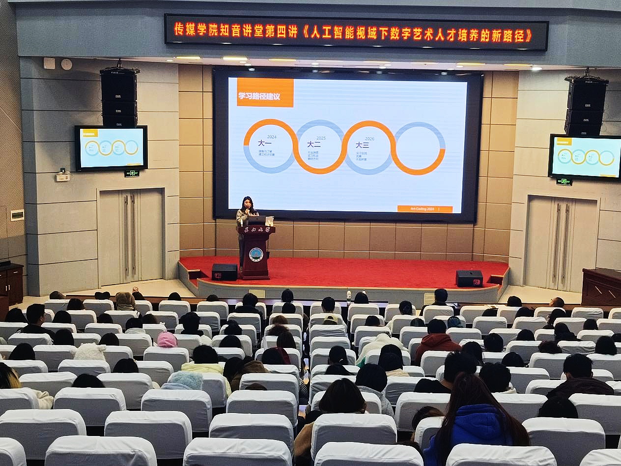 2024年11月28日下午,“知音讲堂”第四讲在校区报告厅开讲。太阳成城集团tyc234cc官网特邀武汉预言软件有限公司负责人、美术总监,武汉山映数字艺术创始人李斯琦就“人工智能视域下艺术设计、数字艺术人才培养的新路径”为主题开展讲座。公司设计专业近300名师生听取了讲座,讲座由经理邹火明教授主持。