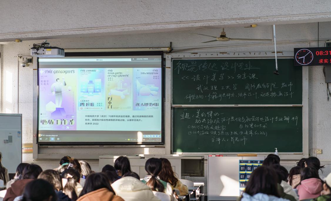 本次课程邀请了武汉理工大学国际教育公司肖淋译老师为主讲人,主题为“美的律动:动态海报设计思维与视觉传达设计专业解析”。本次讲座共分为四个部分:一是视觉传达设计范畴及趋势;二是动态海报分类与思维方法;三是比赛的艺术;四是未来的方向。