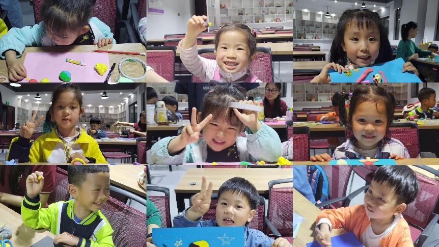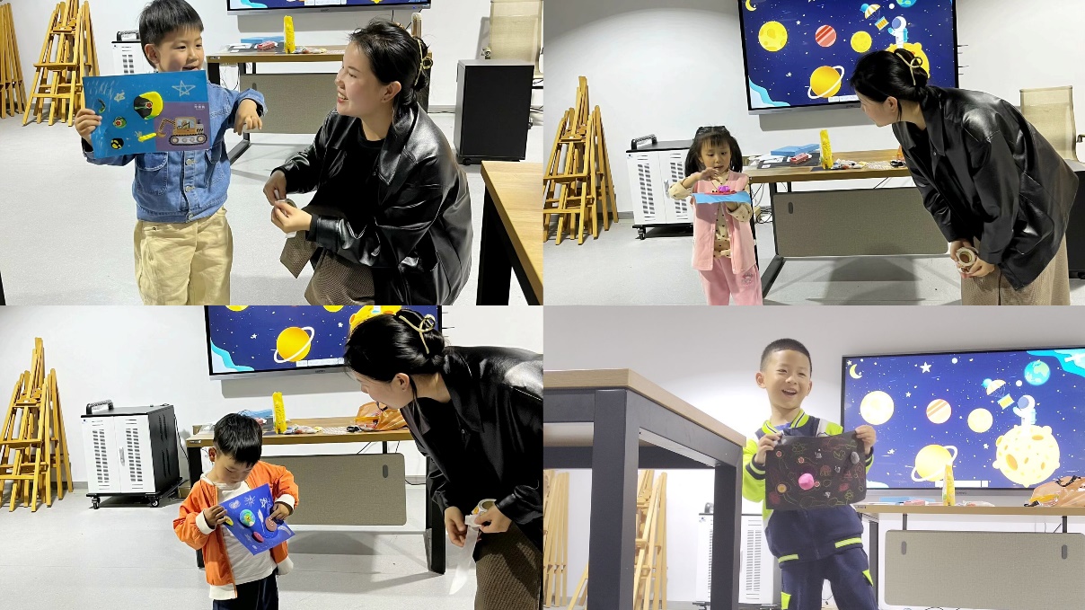 在绘画课现场,小朋友们在陈老师的鼓励下热情地介绍自己的名字、年龄、兴趣、爱好,在交流中不断拉进距离。陈老师以一段有趣的星球科普动画视频,让孩子们更好地了解太阳系的星球,通过视频内容和互动问答的方式,加深孩子们对星球的印象,并详细引出此次绘画创作的主题,即充分发挥自己的想象力,制作一个属于自己的星系空间。在老师详细介绍了太空星球用卡纸、油画棒和黏土的制作方法后,小朋友们开始了自己的创作之旅。在创作过程中,孩子们尽情发挥自己的想象力、创造力。在完成了以“奇妙星球”为主题的作品后,陈老师引导小朋友进行分享展示,并颁发奖励贴纸。在绘画课程结束时,有趣的教学方式深受家长和小朋友们的喜爱。