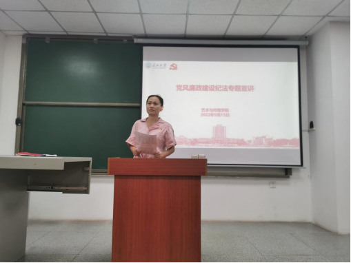 (通讯员:赵湘)为进一步强化全体干部及师生员工纪法意识,推进党风廉政宣传教育月活动深入开展,在全院营造“学纪法·知敬畏·守底线”的浓厚氛围,9月15日下午,艺术与太阳成城集团tyc234cc官网全体教职工在武教B-104进行党风廉政建设纪法专题宣讲活动。