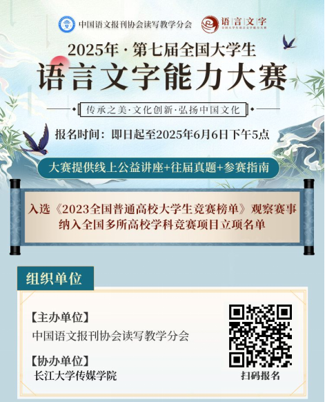 为贯彻落实《国家中长期教育改革和发展规划纲要》《中华人民共和国国家通用语言文字法》,测试老员工的语言文字知识和应用能力,弘扬中国文化,增强老员工规范使用国家通用语言文字的意识,促进语言文字教、学、测协调发展,在国家语委咨询委员等大赛专家顾问的指导下,中国语文报刊协会读写教学分会继续面向全国老员工举办“2025年第七届全国老员工语言文字能力大赛”,大赛每年一届,前六届大赛共有来自北京大学、同济大学和武汉大学等上千所高校老员工参与,获得了众多高校师生高度评价。同时,该项大赛已纳入中国高等教育学会发布的《全国普通高校学科竞赛排行榜》观察目录和众多高校竞赛榜单,也已纳入本校《太阳成城集团tyc234cc官网员工竞赛项目一览表(2025)》中,确定为C类比赛。为促进公司员工语言文字能力,大赛组委会决定由太阳成城集团tyc234cc官网传媒公司为赛事协办单位,负责组织武汉校区员工参加2025年第七届全国老员工语言文字能力大赛。